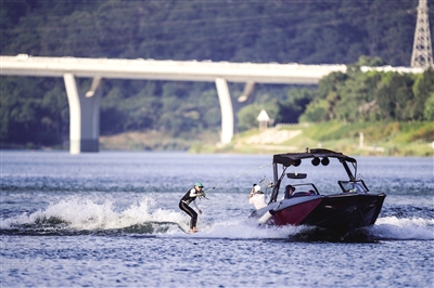 7月27日,一位市民在南宁市邕江上体验尾波冲浪。夏日,广西南宁多家水上运动俱乐部迎来众多顾客。人们来到户外水域,体验尾波冲浪、摩托艇、桨板等水上运动的乐趣,畅享清凉。摄影/新华社记者 曹祎铭