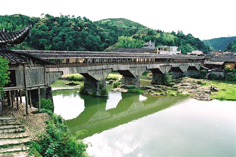 据记载,位于屏南县长桥镇长桥村的万安桥,为五墩六孔木拱廊屋桥。桥长98.2米、宽4.7米,舟形墩,不等跨,最短拱跨为10.6米,最长拱跨为15.2米。桥屋38开间、用柱156根,穿斗式木构架,双坡顶,两侧设木凳。作为国内现存最长的贯木拱廊屋桥,万安桥在我国古代桥梁建筑科学技术史上具有重要价值。