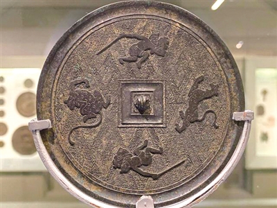 1975年,考古人员在湖北云梦县睡虎地秦墓发掘出土了一枚武士斗兽纹铜镜,后归中国国家博物馆收藏。
