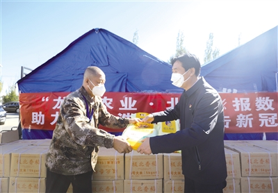 10月4日,“龙鼎农业·北方新报数字农场助力呼和浩特市抗击新冠肺炎疫情”捐赠活动,在新城区红山口村疫情防控现场指挥部举行。1万袋价值88万元的极北香稻大米将由工作人员送到封控区近万户居民家中。(相关报道见3版)