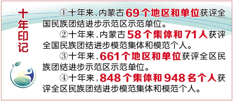 全区各地全面深入持久开展民族团结进步创建进机关、进企业、进社区、进乡镇、进学校、进连队、进宗教活动场所、进网络等活动,民族团结进步创建成果丰硕。十年来,内蒙古69个地区和单位获评全国民族团结进步示范区示范单位,58个集体和71人获评全国民族团结进步模范集体和模范个人。