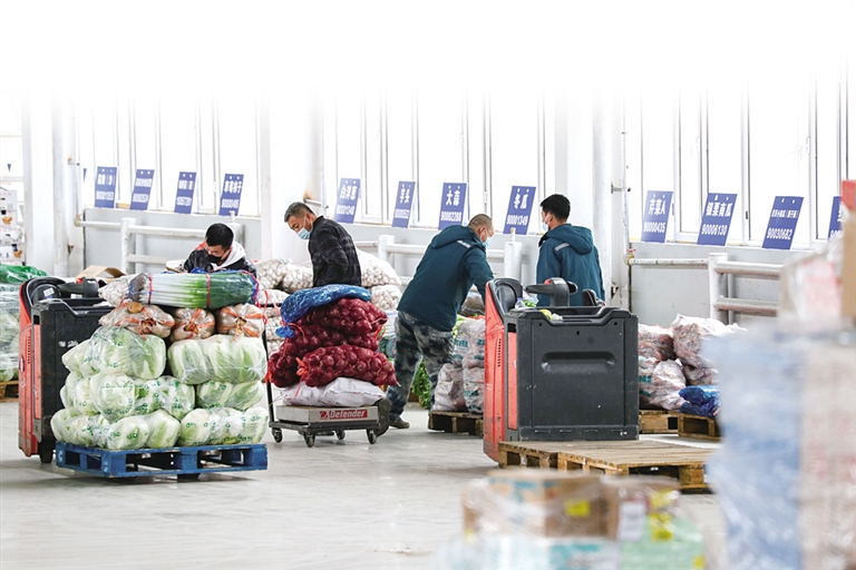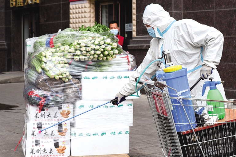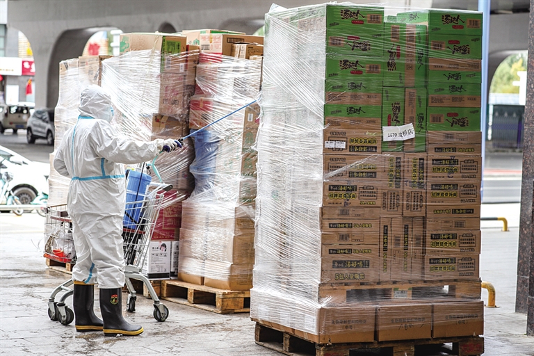 据了解,家家悦确保每日运送新鲜瓜果外,仓库里还备齐了日用品、零食等居民生活必备品。每天一早,仓库工作人员会按照线下各实体店所需进行选品,分拣员认真分拣,运输人员按时送达。商品抵达实体店后,实体店工作人员对运货车辆及所运物品进行消杀,再上架供超市工作人员按照订单进行分包,收银台工作人员扫码打印出支付账单,由配送员送到居民手中。
