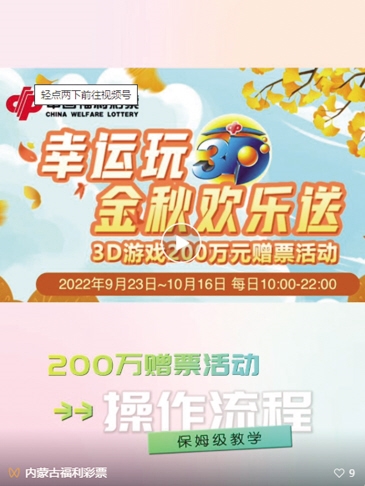 秋高气爽,五谷飘香。秋天是丰收季节,是喜悦的季节,也是幸运的季节。目前,内蒙古福彩3D游戏200万元赠票活动已进入倒计时,彩民朋友们快快行动起来,去收获自己的金秋好运吧!