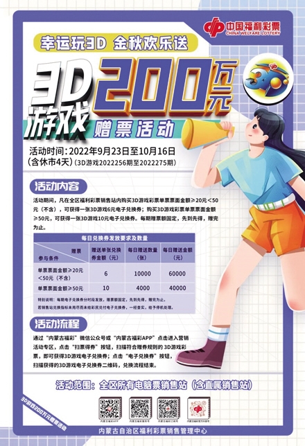 活动期间,凡在全区福利彩票电脑票销售站内购买3D游戏彩票单票票面金额≥20元<50元(不含)的彩民朋友,可获得一张3D游戏6元电子兑换券;购买3D游戏彩票单票票面金额≥50元的购彩者,可获得一张3D游戏10元电子兑换券。