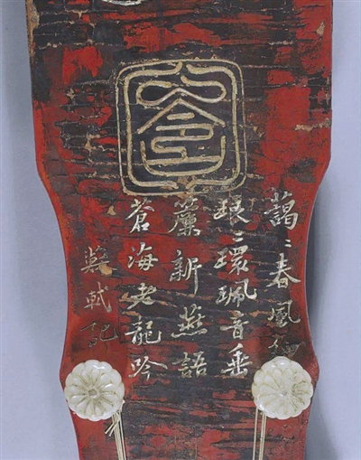 苏轼和黄庭坚之后,不断有收藏家珍爱这张琴。琴龙池的右侧行书刻有:“泠然希太古,诗梦斋珍藏。”并有“诗梦斋”印落款。诗梦斋,是著名的清代古琴家叶赫那拉·佛尼音布的书斋名称,佛尼音布收藏之后,九霄环佩还有最后一段铭文,刻的是“楚园”印,这方印的主人是清末著名收藏家刘世珩的印。