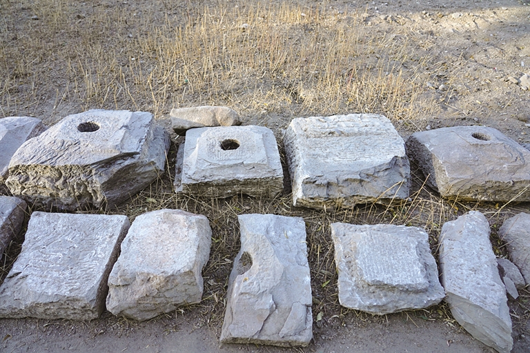 “田字房”建筑共33间,各间皆4.48米见方,廊深1.28米。该建筑地面以上部分虽已不存,但基址保存尚好,台基保存高约0.55米,由9层夯土夯打而成。今年发掘的区域位于“田字房”西南,台基面上可见柱顶石、铺地方砖、排水沟,台基外围可见如意踏跺、卵石散水、道路等遗迹。台基基槽底部则是密集的地钉孔,地钉即“柏木桩”,起到防止建筑下沉的作用。