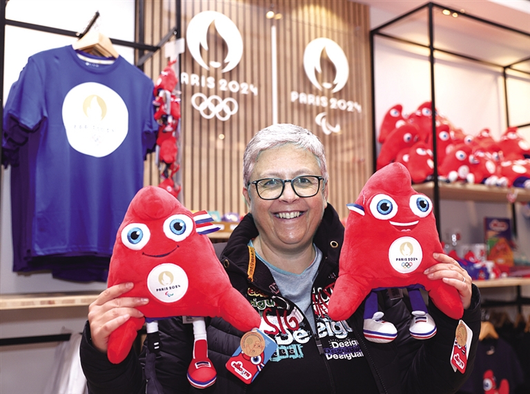 11月15日,一名顾客在巴黎2024官方特许商品旗舰店展示购买的吉祥物“弗里热”毛绒玩具。当日,首家巴黎2024官方特许商品线下旗舰店在法国巴黎市中心开业,开始售卖2024年巴黎奥运会和残奥会相关的特许商品。
