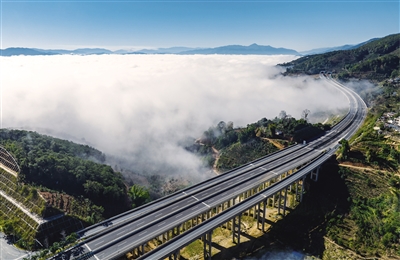 这是在云南省临沧市拍摄的云海间的天猴高速。 在云南省临沧市,晴朗的冬日是欣赏云海的好时节。登临山巅俯瞰,云雾在山谷间如海水般波起峰涌,蔚为壮观。 摄影/新华社记者 江文耀