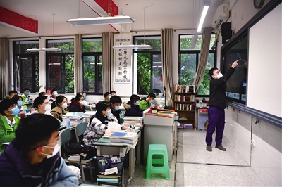 12月12日,在重庆市铁路中学校高三年级的教室内,学生们在课堂上听课。当日,重庆中心城区高三、初三年级开始有序恢复线下教学。