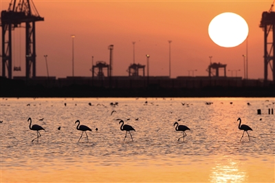这是12月12日在埃及塞得港省福阿德港自然保护区拍摄的火烈鸟。 每年冬季,大批火烈鸟飞抵埃及北部的福阿德港自然保护区觅食过冬。(据新华社报道)