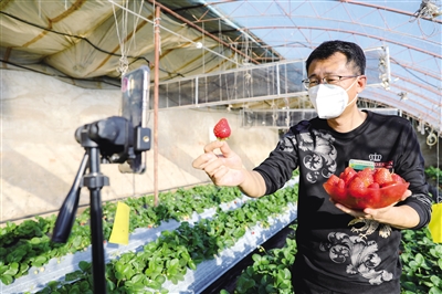 12月18日,科技特派员徐晓宇在绿源高档草莓采摘园内直播带货。据了解,呼和浩特市草莓已经进入销售旺季,种植户通过直播带货,线上销售,对接商超等方式增加销售渠道,保障新鲜草莓供应。目前,草莓产业已成为呼和浩特市的特色品牌产业,2022年栽培面积达到2000余亩,预计总产量300万公斤,产值近亿元。摄影/草原全媒·北方新报首席记者 牛天甲