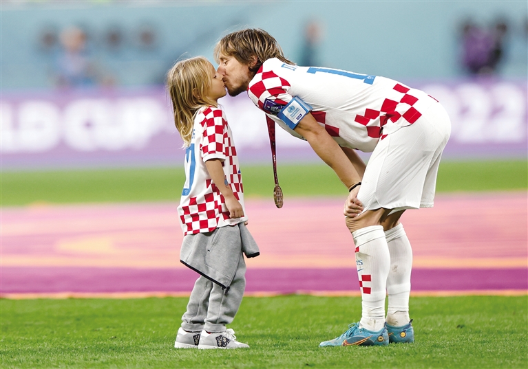 当天在哈里发国际体育场,是“魔笛”第162次代表国家队出征,也是他世界杯的最后一舞。他一直不知疲倦地奔跑,参与协防与回撤,在中场组织进攻,细致观察四周动向,抬手指挥队友跑位,触球和传球刹那给出“最优解”……每次主罚任意球或角球时,球迷都会高喊“卢卡!卢卡”……
