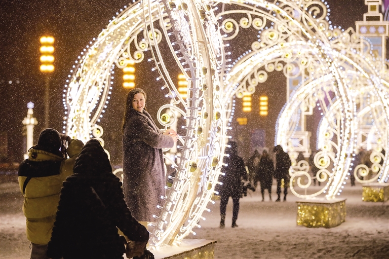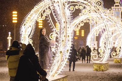 12月27日,一名女子在俄罗斯首都莫斯科的彩灯装饰旁留影。临近新年,俄罗斯首都莫斯科街头节日氛围渐浓。 摄影/新华社记者 曹 阳