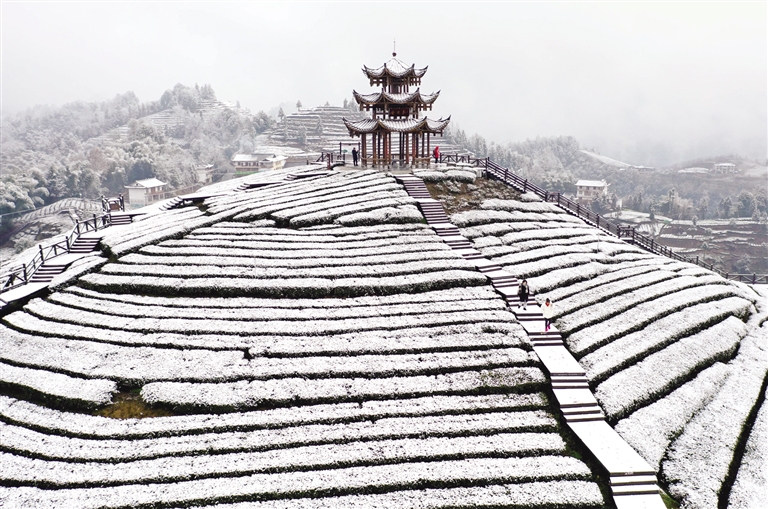 这是12月28日拍摄的湖北省宣恩县万寨乡伍家台村的茶园雪景。 近日,多地迎来降雪天气。雪后的乡村、古城、梯田、茶园银装素裹,宛如一幅精致的画作,美不胜收。(据新华社报道)