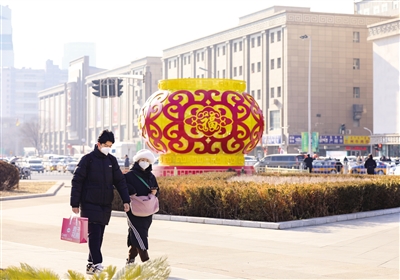 1月4日,呼和浩特火车站出站旅客从站前广场的巨型灯笼前经过。随着2023年春节临近,呼和浩特街头巷尾年味渐浓,道路两侧挂起了火红的灯笼,处处洋溢着喜庆的氛围。摄影/草原全媒·北方新报首席记者 牛天甲