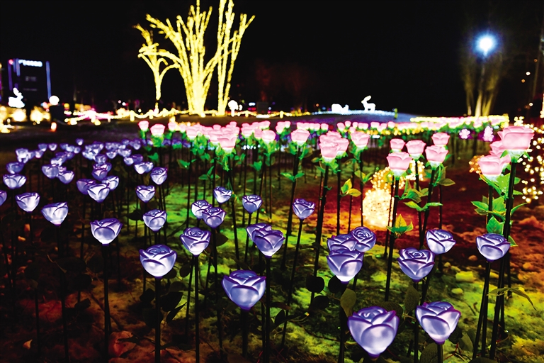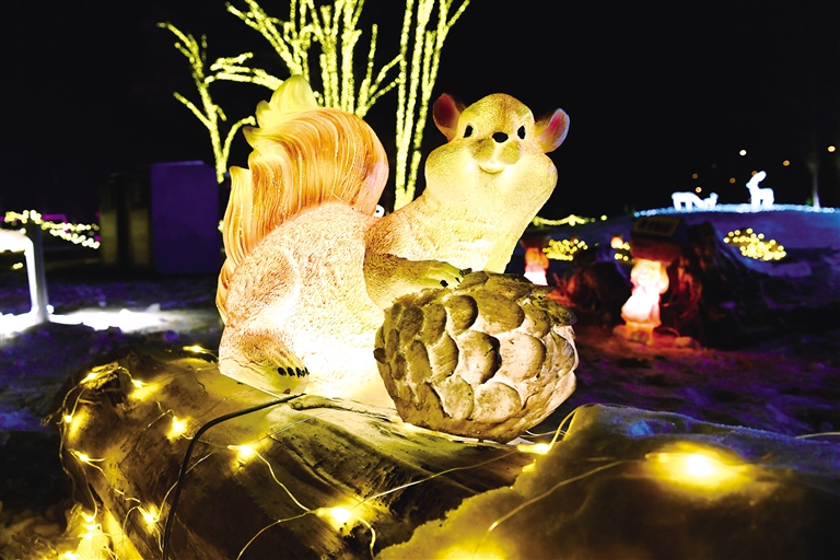 记者又来到小草公园,这里的夜景五彩缤纷,花朵、动物等各类造型灯景和人工造雪景观吸引市民前来观赏游玩。