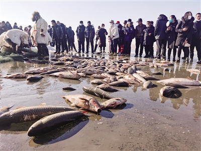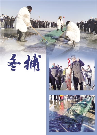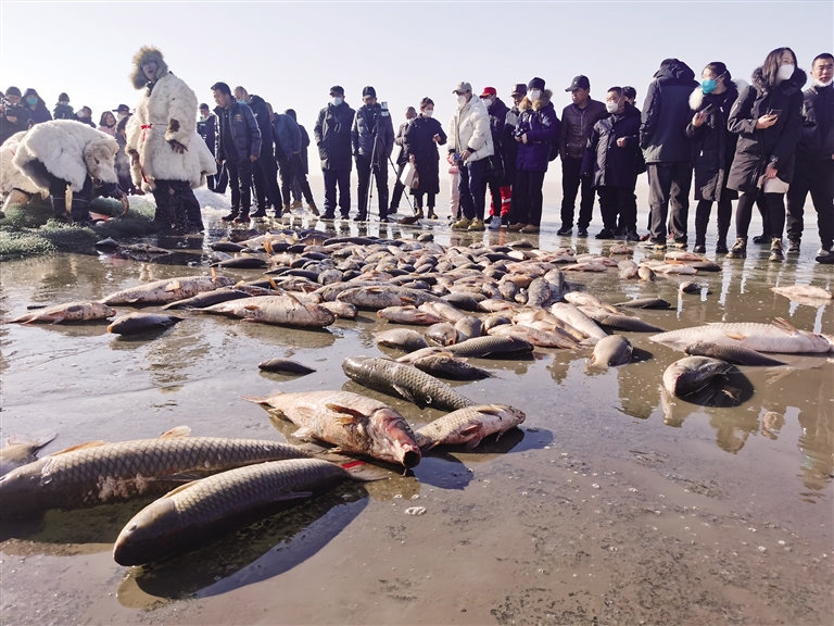 在冬捕现场,游客们围在冰封的湖面上,等待鱼儿出现。“鱼出来啦!鱼出来啦!”在欢呼声中,一条条活蹦乱跳的鱼被缓缓拉上冰面,大家争相拍照,见证这一激动人心的时刻。随后,重达32斤的头鱼现场拍卖,最终以68888元的价格成交。