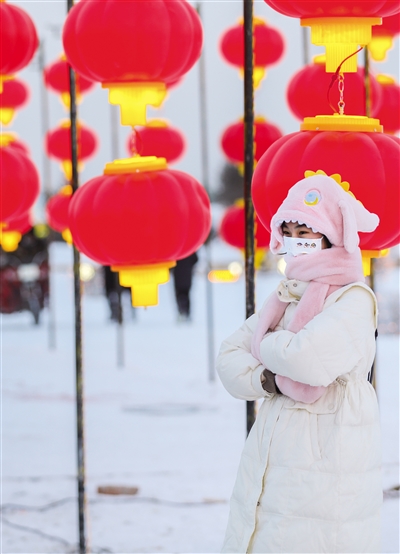 1月17日,游客在冰雪节上留影,茫茫白雪与火红灯笼相映成趣。当日,2023呼和浩特冰雪节在大黑河军事公园启幕,冰雪景观美轮美奂,宛如走进童话世界。游客不仅可以欣赏冰雕雪雕、艺术造景,还能参与到“我们的节日”主题活动中,观看舞蹈、戏曲等演出。此次冰雪节将持续到2月21日。