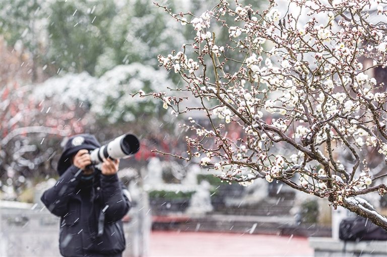 1月15日,在重庆市南川区大观镇铁桥村,摄影爱好者在雪中拍摄梅花。凛凛冬日,寒潮来袭。近日,我国迎来大范围降温降雪天气,“不知天上谁横笛,吹落琼花满世间”,神州大地银装素裹,蔚为壮美。