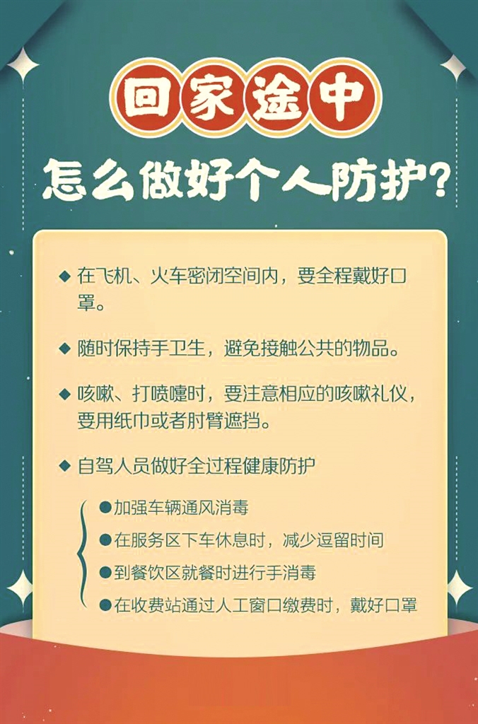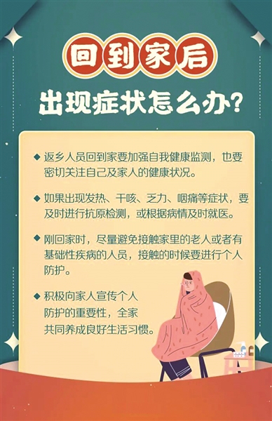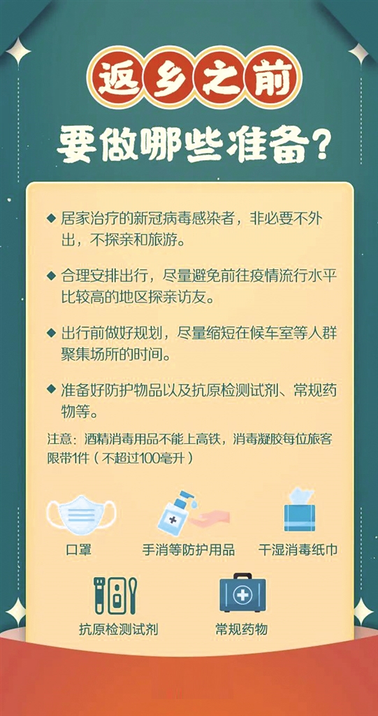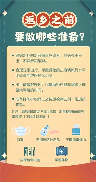 春节将至,返乡之前要做哪些准备?回家途中怎么做好防护?返乡后怎样保护未阳老人?阳康人群在饮食运动方面要注意什么?平安过春节,送你这些健康锦囊,没阳、阳过的都来看看。