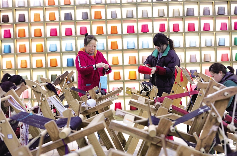 1月29日,在湖南省张家界市武陵源区乖幺妹土家族织锦生产研发基地,工人在制作土家族织锦产品。春节假期过后,各地企业开足马力加紧订单生产,生产车间一片忙碌。(据新华社报道)