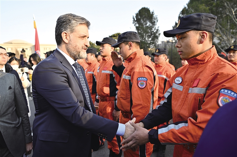 2月7日,土耳其驻华大使约南与即将出征的中国救援队队员握手。应土耳其政府请求,中国政府派遣中国救援队赴土耳其实施国际救援。截至7日晚,发生在土耳其的强震已致土耳其、叙利亚两国近5000人死亡、两万余人受伤。中国政府第一时间启动紧急人道主义援助机制,向土耳其和叙利亚提供紧急援助。(相关报道见5版) 摄影/新华社记者 李 鑫