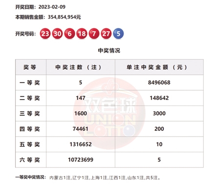 2月9日晚,中国福利彩票双色球游戏进行第2023014期开奖。当期双色球红球号码为06、07、18、23、27、30,蓝球号码为05。当期双色球头奖开出5注,单注奖金为849万多元。这5注一等奖花落5地,其中一注出自我区乌海市。二等奖开出147注,单注奖金14.86万元。计奖后,奖池累计金额为18.55亿多元。