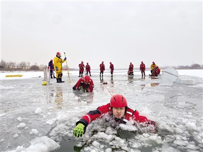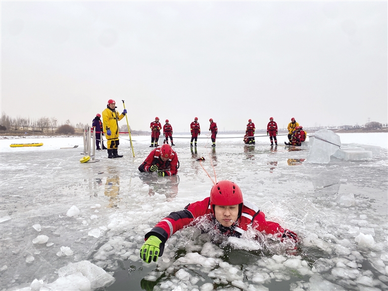 在专业培训中,消防指战员下水“救援”。冰上锚点制作、单人冰面技术、抛绳包救援、单人救助、双人救助、浮桥救援……2月8~12日,呼和浩特市消防救援支队特勤大队水域救援专业队的12名“蓝朋友”,在大黑河上进行了紧张的冰水救援技术专业培训。随着天气转暖,各地冰上落水事故多发,本次培训便是针对低温、雨雪等应急救援而开展,旨在进一步提升消防指战员的应急处置综合能力。文/草原全媒·北方新报记者 张巧珍 摄影/王 哲