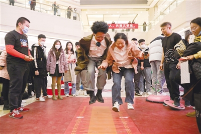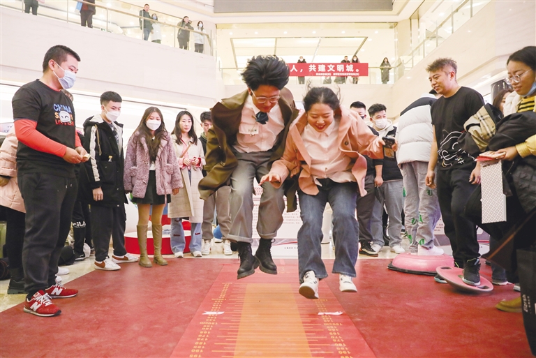 2月14日,情侣们现场玩起了立定跳远。当日,由内蒙古自治区体育彩票销售管理中心主办的“体彩新春季,宏兔大展启新程”系列活动——遇见你遇见爱遇见体彩专场品牌推广活动在呼和浩特市举行。活动中,情侣们进行了携手跨越一生一世、相“手”520等趣味游戏。据了解,截至2022年年底,内蒙古体彩累计销售超555亿元,筹集超过145亿元体彩公益金,全面推动着内蒙古地区全民健身和竞技体育的发展。摄影/草原全媒·北方新报首席记者 牛天甲