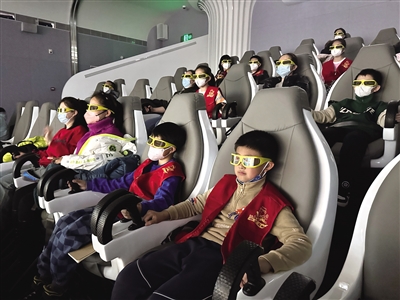 最让小记者们流连忘返的,是来自《乳宇宙大冒险》的视觉冲击,坐在“驾驶舱”椅子上,系好安全带,戴上特殊眼镜,一场堪比“小黄人闹翻天”的5D电影拉开序幕。大家跟随精彩剧情,感受座椅摇摆和水雾袭击,当剧情推动到“橙子精灵”时,还能闻到清爽的橙子果香。据介绍,这里是全球首个工业游5D影院,先进的声光电技术融合多元化、年轻化、萌趣化、故事化元素,直观呈现伊利的品牌发展历程。
