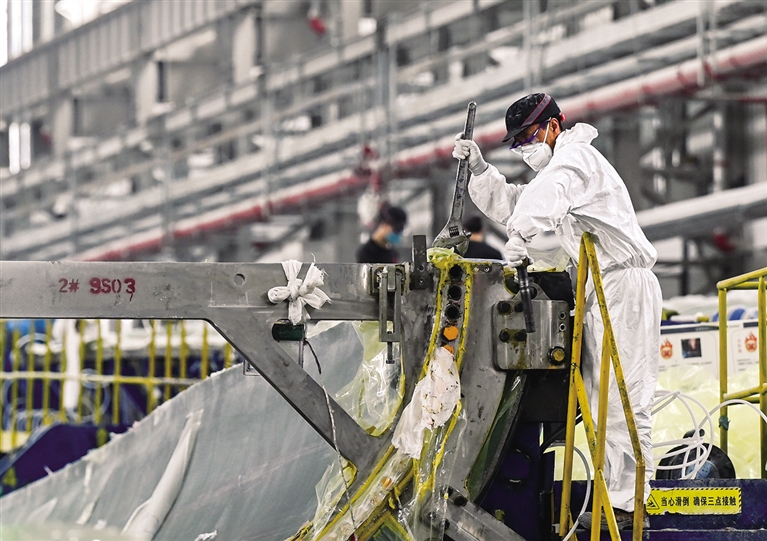 在内蒙古乌兰察布市远景北方能源有限公司,工人在风机叶片生产线上工作。近日,内蒙古各地风电装备制造生产全面提速,乌兰察布市、通辽市重点打造风电装备制造产业集群,助力当地经济高质量发展。 摄影/新华社记者 连 振