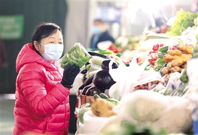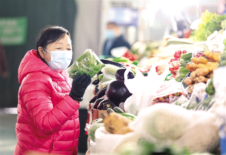 2月23日,呼和浩特市民在保全庄农贸市场购买蔬菜。2月13~19日,呼和浩特市商务局对16家生活必需品样本企业监测数据显示,全市生活必需品市场货源充足、价格运行平稳。重点监测的粮油类、肉类、禽类、蛋类、蔬菜和水果类等51种商品零售价格降多涨少。其中,30种蔬菜价格呈17降9涨4平,平均零售价格为8.42元/公斤,环比下降2%。目前,美通、东瓦窑等蔬菜批发市场库存充足,供需平衡。