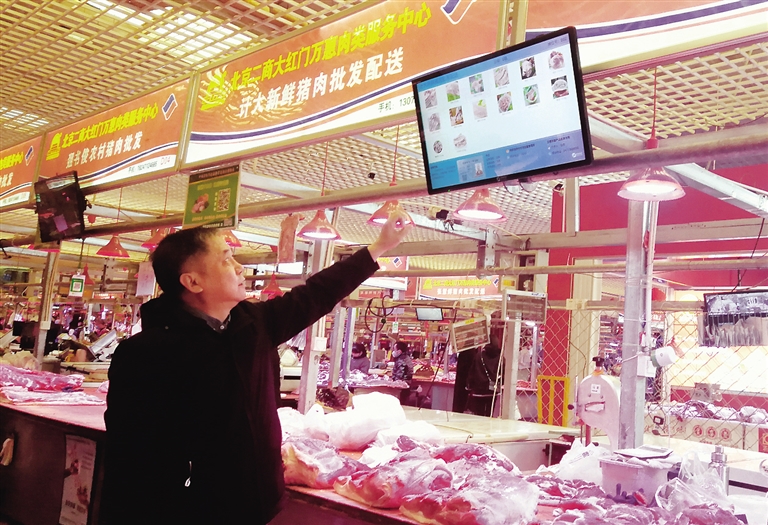 在肉食大厅门口,摆放着一台智能查询机,可对当日牛羊猪肉、海鲜、熟食等商品销售价格进行查询:五花肉、前肩20元/公斤,排骨26元/公斤,鲤鱼22元/公斤……万惠农贸市场副总经理贺豹在介绍说,查询机上公示的价格由市场定价,商户在销售时可以低于但不能高于公示价格。