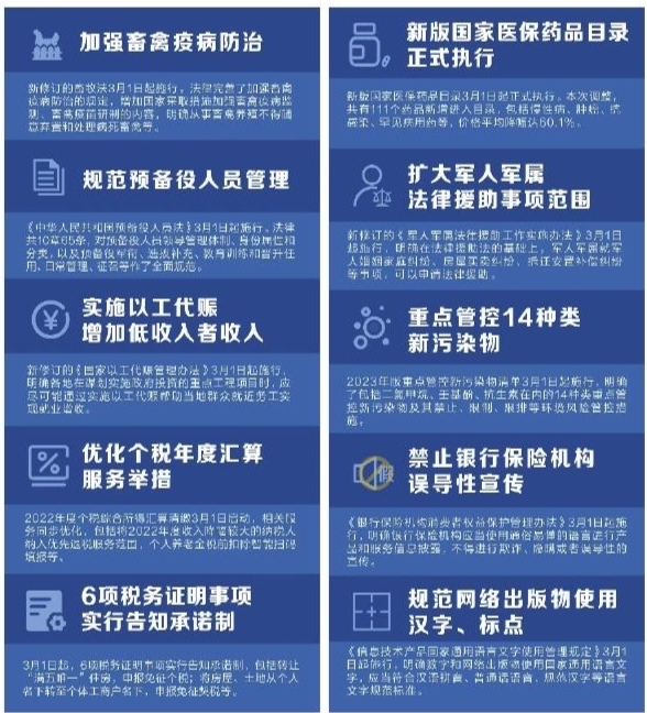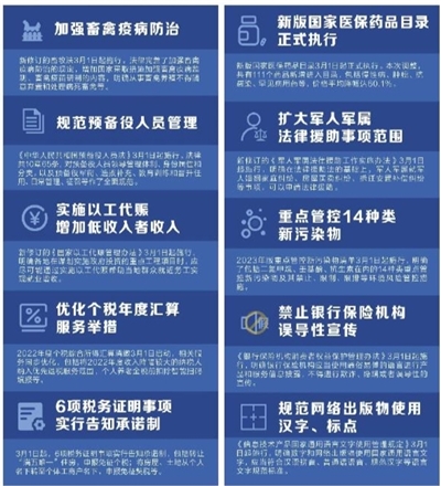 3月,一批新规开始施行。111个药品纳入新版国家医保药品目录;新版重点管控新污染物清单保卫碧水蓝天;实施以工代赈增加低收入者收入……更完善的法治,更安心的保护。(据《人民日报》)