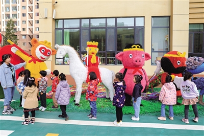 3月22日,在赛罕区第三幼儿园院内,孩子们看到这几个西游记仿真绿雕后开心不已。据介绍,本月大班孩子的学习主题就是“大话西游”,并且还排练了“大话西游”儿童剧。据了解,内蒙古道德模范杨岭向幼儿园捐赠了一组西游记人物仿真绿雕,让孩子们与师徒四人有了更“亲密”的接触。摄影/草原全媒·北方新报首席记者 牛天甲