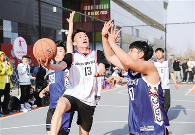 4月1日,参赛选手在比赛中带球上篮。当日,由呼和浩特体育局、呼和浩特体育总会主办的“健康正出发 周末动起来”呼和浩特全民健身系列活动——4v4篮球运动会在呼和浩特市王府井奥莱如意小镇攻将运动公园开幕。据了解,本次比赛共有120名选手参赛,旨为篮球爱好者提供一个竞技交流的平台,带动更多的市民参与全民健身。