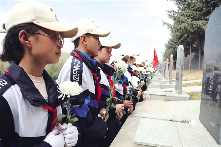 纪念碑庄严矗立,雕刻着“革命烈士永垂不朽”大字。两侧,烈士墓碑静静地坐落在苍松翠柏之中。弘文中学、固原二中学生先后组织开展缅怀祭奠活动,聆听了任山河战斗的故事。同学们擦拭烈士墓碑,并向革命先烈敬献小白花。