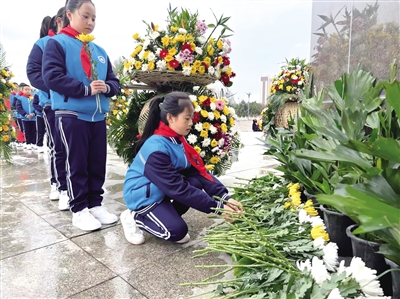 在革命烈士纪念碑前,师生默哀鞠躬,敬献花篮,追忆革命先烈的不朽功勋,表达对革命先烈的深切缅怀之情。