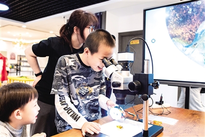 4月8日,孩子们通过显微镜观察琥珀的构成。当日,“物像万年——琥珀研学之旅”主题公益活动在呼和浩特市玉泉区举行,30多名孩子通过参观琥珀展品、微距离观察琥珀、动手进行科学实验等环节,拓展科普视野,感悟琥珀魅力。 摄影/草原全媒·北方新报首席记者 牛天甲