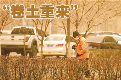 4月10日,一位环卫工人正在清扫街道。当日15时前后,呼和浩特市大部地区出现扬沙、沙尘暴天气,能见度小于1000米。据了解,这是今年呼和浩特市出现的第三次沙尘暴天气。