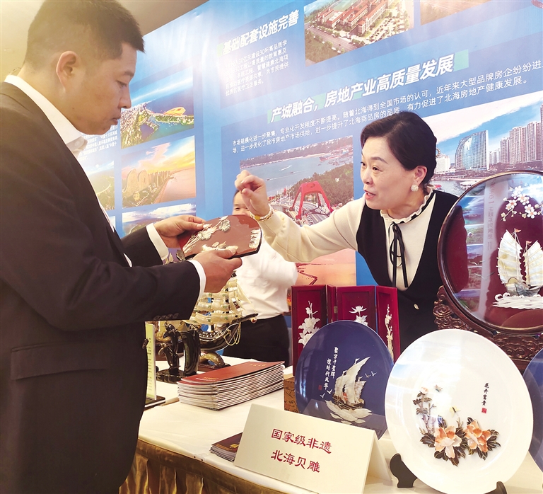 活动中,北海文化界知名人士和有关企业带来了非遗贝雕、角雕及北海南珠等特色产品。