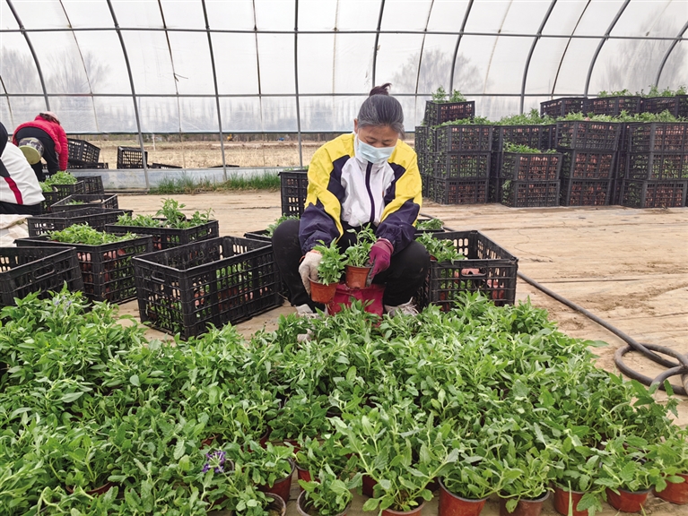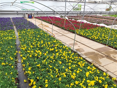 走进一个个大棚,工作人员有的在整理枯叶,有的在摆放种苗盆,工作井然有序。大棚内姹紫嫣红,红、黄、粉、紫等各色花卉分类排放,形成浓郁色块,俨然是一处绚丽多彩的五彩花田。