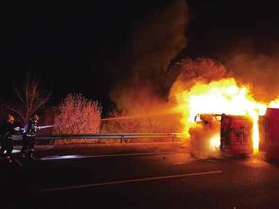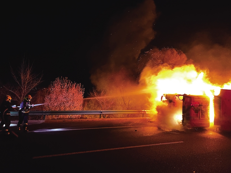 事故发生后,赤峰市消防救援支队三道东街特勤站第一时间派人赶赴现场。“我们一共出动2辆消防车10名消防救援人员,抵达现场时是22时53分,当时冷藏车侧翻横挡在高速路中间,车辆正处于猛烈燃烧阶段,现场火光冲天,浓烟滚滚,所幸车内两名被困人员已被现场过往司机救出。”4月20日,当日出警的三道东街特勤站指挥员邱泓博接受记者采访时回忆,经了解,车内装有5吨生猪肉,车辆油箱已经发生爆炸。为了节省救援时间,在交警的交通管制下,救援人员从高速一侧穿越高速隔离护栏,对起火部位紧急扑救,经过1个多小时的协同作战,大火被成功扑灭。遗憾的是,由于长时间的高温火烤,5吨猪肉已无法食用。
