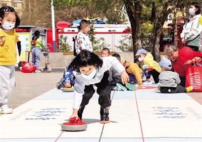 4月22日,一位小朋友在陆地冰壶项目中掷壶。当日,呼和浩特市“健康快车”进社区活动启动。据了解,本次活动设置了具有各类功能的互动体验区,不仅有体育项目示范教学,还有各类健康义诊、知识讲解、安全演练。摄影/草原全媒·北方新报首席记者 牛天甲