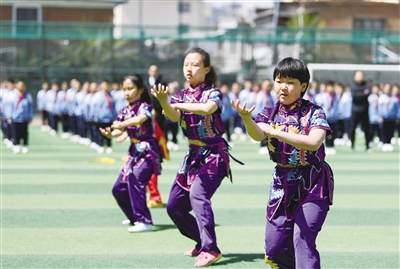 4月25日,内蒙古大学附属小学的学生们正在进行武术展示。据了解,该校一直将武术作为办学特色,大力弘扬发展中华武术文化,将武术健身、武术竞技、武术表演融合,让学生在感受传统武术魅力的同时,积极锻炼、强健体魄。