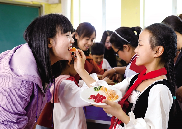 5月12日,呼和浩特市玉泉区五塔寺东街小学学生请妈妈品尝自己刚刚做好的水果拼盘。当日,该校邀请妈妈们走进校园参与活动,孩子们献上水果拼盘表达对妈妈的浓浓爱意与感恩之情。