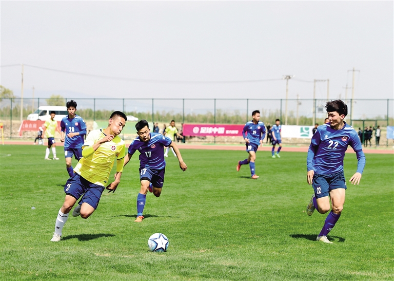 5月13日,锡林郭勒盟第二中学足球队球员(黄色)在比赛中带球突破。当日,2023第二届中国青少年足球联赛(男子U17)北区预选赛呼和浩特赛区的比赛拉开帷幕,本次赛事分别在呼和浩特青少年足球训练基地与国家北方足球训练基地展开。据了解,本次比赛为期6天,在首日的争夺中,张家口市宣化第一中学足球队以1:0战胜了锡林郭勒盟第二中学足球队,呼和浩特市第十四中学足球队0:1不敌开封高中实验学校足球队。