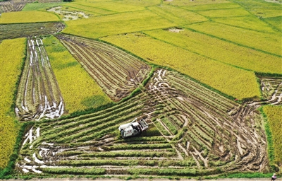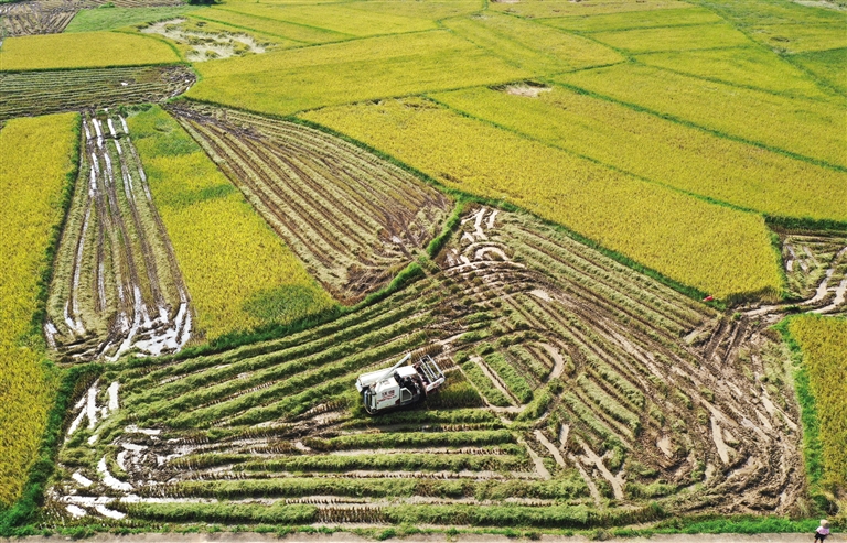 5月16日,收割机在稻田作业。5月以来,位于海口市三十六曲溪两岸的水稻进入夏收时节,一片片成熟的稻田与蜿蜒曲折的河道交织,勾勒出一幅美丽的画卷。摄影/新华社记者 郭 程