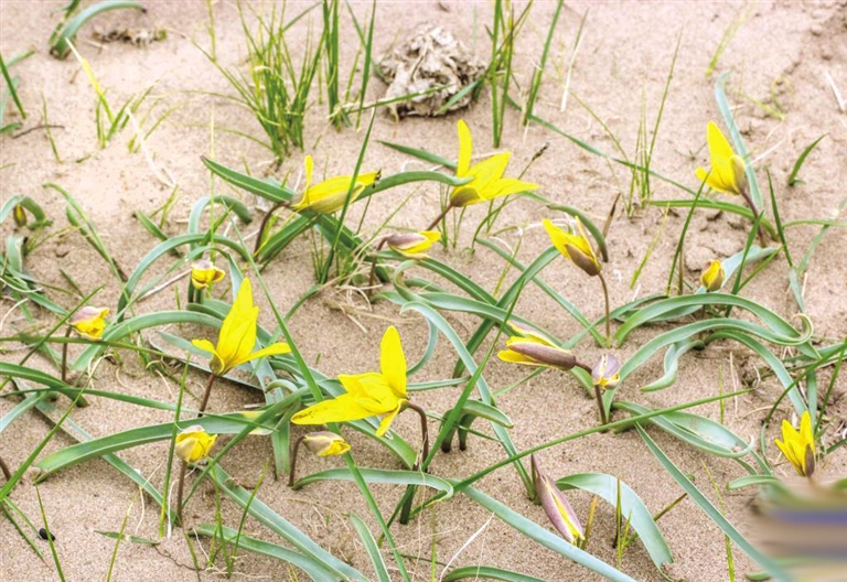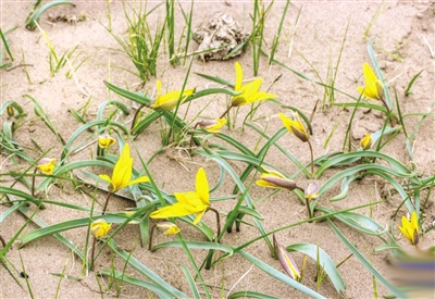 蒙古郁金香是多年生草本植物,一般高10~25厘米,鳞茎卵形,有6个鲜黄色花被片,雌蕊略短于雄蕊。蒙古郁金香属于早春类短命旱中生植物,生于草原带覆沙地中,仅分布于我国内蒙古,是内蒙古特有种,也是郁金香属植物在全球分布最东的一个物种。