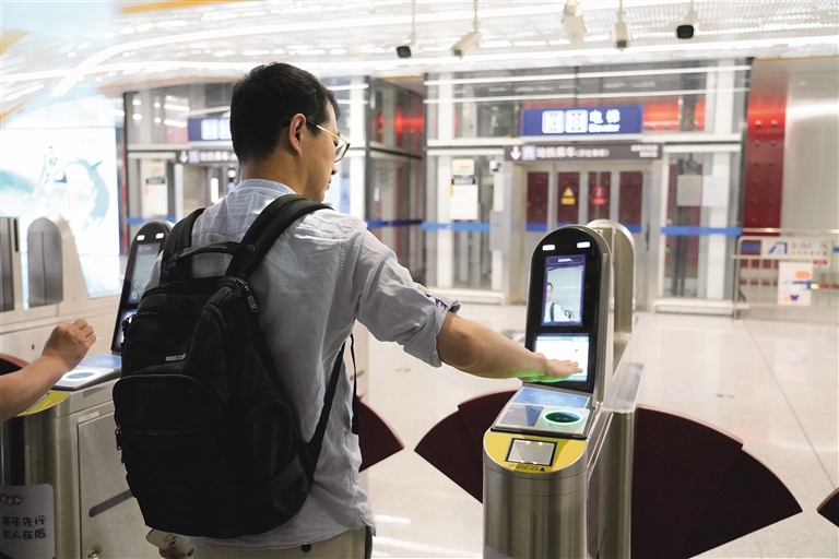 ~~~5月21日,乘客在北京大兴机场线大兴机场站刷掌过闸。当日,北京轨道交通大兴机场线刷掌乘车服务正式上线。乘客通过注册开通刷掌乘车服务后,即可在该条地铁线路刷掌过闸乘车。(据新华社报道)